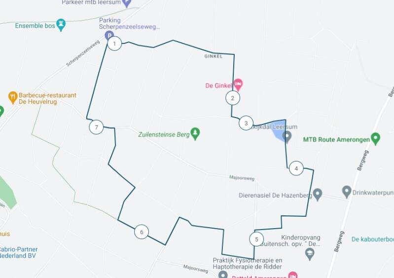 Als u vanuit het dorp Leersum de Scherpenzeelseweg afrijdt en de borden einde bebouwde kom Leersum bent gepasseerd is na ong. 600 m. aan de rechterkant het parkeerterrein waar het startpunt van de wandeling is. U loopt in oostelijke richting naar het einde van het parkeerterrein en gaat rechtdoor langs de afsluitboom. Let op: langs de route staan geen markeringen van deze archeologische wandeling. Volg het hoofdpad zo'n 700 m. rechtdoor tot u uitkomt op een viersprong voor een heidestrook. U wandelt rechtdoor over het bospad tot een asfaltweggetje. Ga rechtsaf in zuidelijke richting tot de afsluitboom bij landgoed De Ginkel. Neem het bospad rechtdoor tot het einde van de rhododendronhaag.